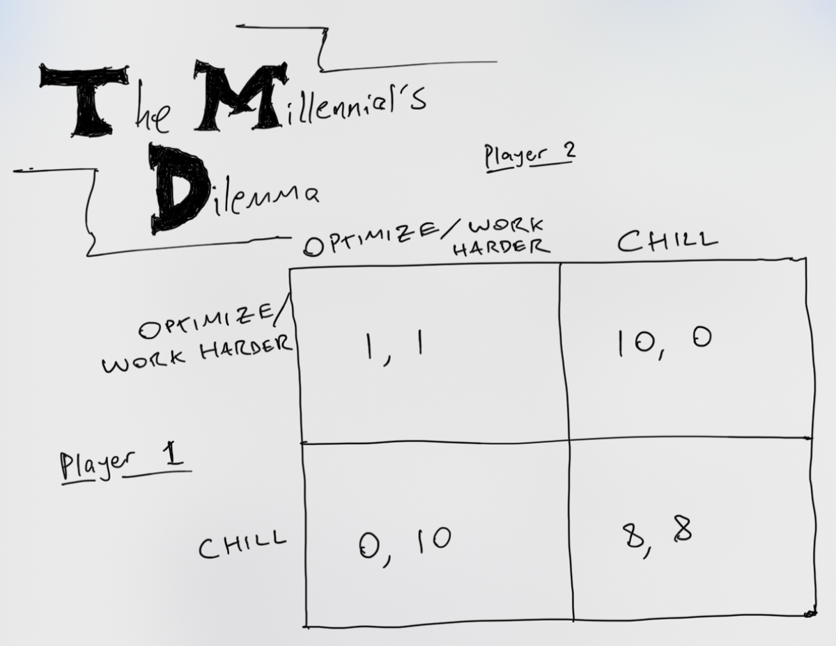 It isn’t because we see intrinsic value in the absurd hours we put in, though to cope, many of us have convinced ourselves we do. It’s because the rules of the game we play dictate that working those hours — and outworking everyone else — is our dominant strategy. When we see long weekends and think “work before play,” when we see Friday nights and think “sleep before clubs,” when we see escalators as accelerators and not opportunities to “just take a second,” we’re nothing more than hyper-rational prisoners making a decision that would be inaccurately characterized as a dilemma because the answer is obvious.